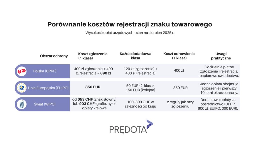- w przypadku znaku polskiego – zgłoszenie przechodzi przez UPRP (opłata 600 zł),
